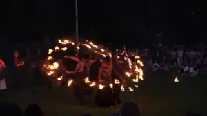 Le Souffle du Loup mêle légende et feu dans une parade onirique. Esprits sauvages traversent la foule, flammes et symboles mystiques s’animent, racontant l’histoire d’un totem ancestral et hypnotique. Durée : 35 min.